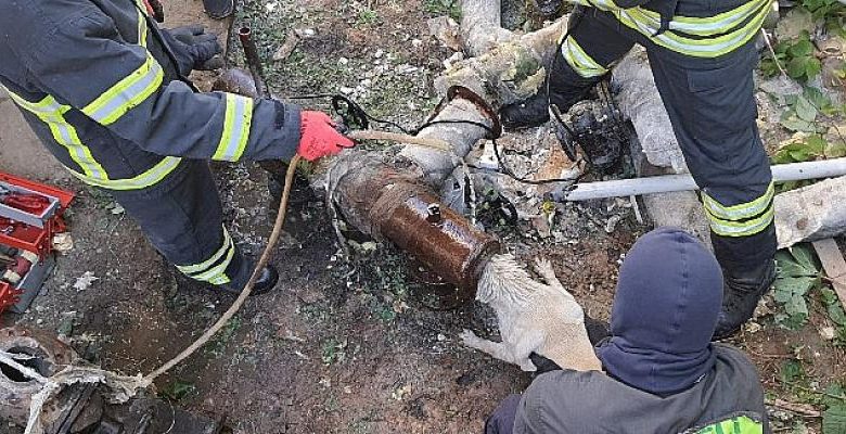 Demir boruya sıkışan köpeği itfaiye kurtardı
