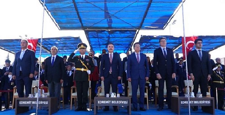 Tebriklerin ardından protokol üyeleri Şehit Hamdibey Meydanı’ndaki tören alanına geçti. Burada program saygı duruşu ve İstiklal Marşı’nın okunmasıyla başladı. Ardından Kaymakam Ahmet Odabaş, 19. Komando Tugayı ve Garnizon Komutanı Tuğgeneral Mehmet Kurugül ve Belediye Başkanı Selman Hasan Arslan tören alanında bulunanların bayramını kutladı. Cumhuriyet Bayramı dolaysıyla günün anlam ve önemini belirten bir konuşma yapan Edremit Kaymakamı Ahmet Odabaş, vatandaşların bayramını kutladı.