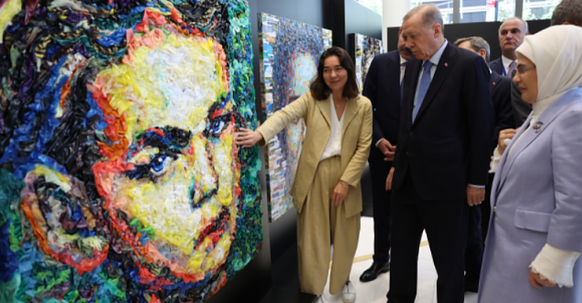 Sanatçı Deniz Sağdıç’tan atık eserler hakkında bilgi alan Cumhurbaşkanı Erdoğan, pil, ilaç, plastik, tekstil, şişe kapakları ve elektronik eşya gibi çok farklı atıklardan tasarlanan tabloları etkileyici bulduğunu söyledi.