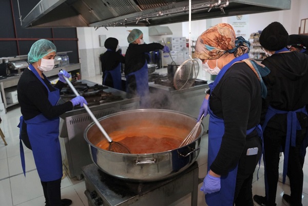 Kazanlarda özenle hazırlanan sıcak yemekler, ilçedeki sosyal tesislerde ve gönüllü vatandaşların yanında kalan depremzedelere ulaştırılıyor.