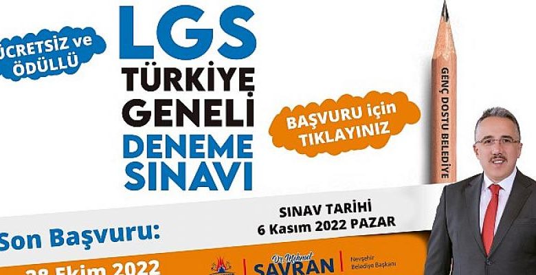 Nevşehir Belediyesi, LGS sınavlarına hazırlanan ortaokul son sınıf öğrencileri için 6 Kasım 2022 tarihinde Türkiye geneli deneme sınavı düzenleyecek. Ödüllü deneme sınavına katılmak isteyen öğrenciler, 28 Ekim 2022 Cuma gününe kadar başvurularını www.nevsehir.bel.tr adresinden online olarak yapabilecek.