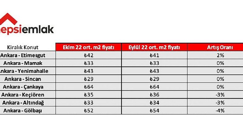 Ekim ayında kira artış hızının durağanlaşmasının yanında m2 fiyatlarında gerilemeler de söz konusu. Gölbaşı ilçesinin m2 fiyatı 54 TL’den 52 TL’ye gerileyerek yüzde 4 azaldı. Gölbaşı’ndan sonra yüzde 3 ile Altındağ ve Keçiören, ortalama m2 fiyatı gerileyen iller arasında yer aldı.
