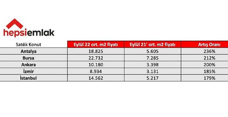 2021 yılının Eylül ayı ile karşılaştırıldığında satılık konut fiyatlarında; yıllık bazda verilere bakıldığında satılık konut fiyatlarında; yüzde 264 oranla İstanbul Kağıthane 6.362 TL’den 23.186 TL’ye yükselerek en fazla artış gösteren ilçe oldu. İkinci sırada yüzde 257 oranla İstanbul Şişli, üçüncü sırada ise yüzde 252 oranla Antalya Muratpaşa yer aldı.
