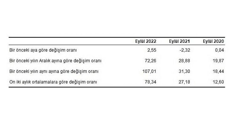 H-ÜFE (2017=100) 2022 yılı Eylül ayında bir önceki aya göre 2,55, bir önceki yılın Aralık ayına göre 72,26, bir önceki yılın aynı ayına göre 107,01 ve on iki aylık ortalamalara göre 78,34 artış gösterdi.